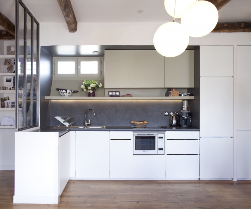 La cuisine et les placards sont réalisés à partir de caissons ikea et d’éléments fabriqués en medium, les portes sont faites par le menuisier en medium laqué. Le plan de travail en agglo hydrofuge revêtu d’un mortier auto-lissant donne un aspect minéral au plan de travail. Le petit fenestron existant dans la cuisine apporte une pointe de lumière nécessaire et que l’on retrouve dans l’entrée grâce à la baie vitrée fixe qui sépare la sépare de la cuisine.