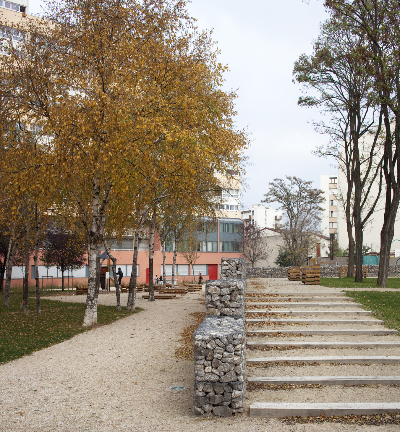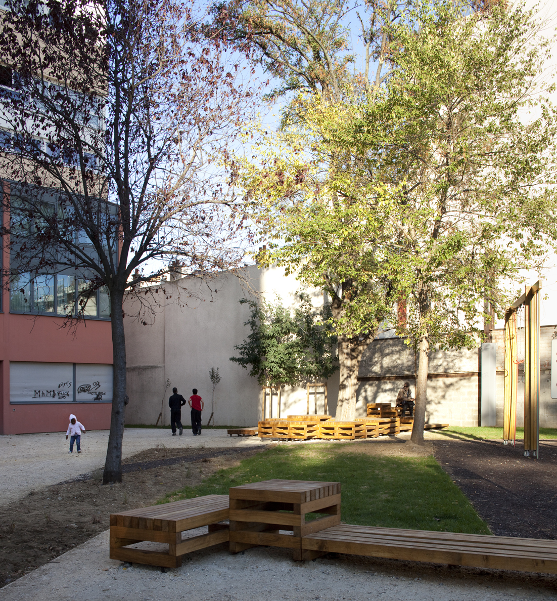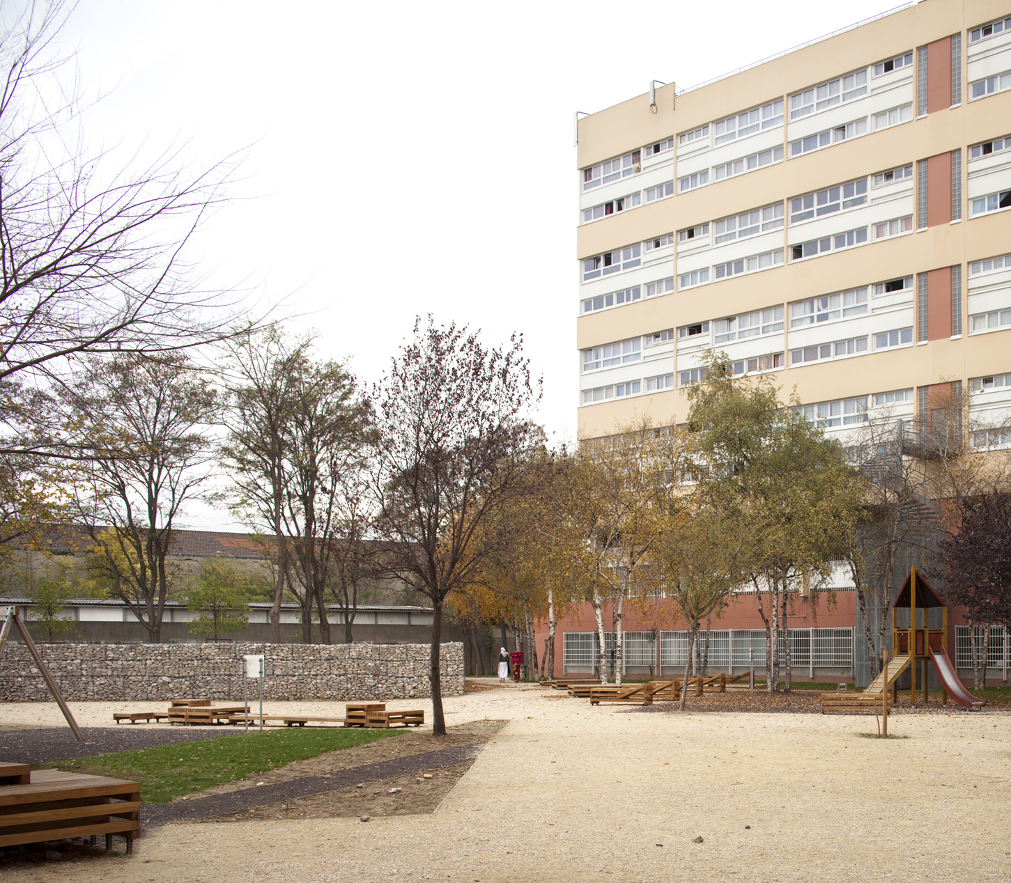 Le square: perspective depuis l’accès et traversée menant au siège de l’OPH d’Aubervilliers.