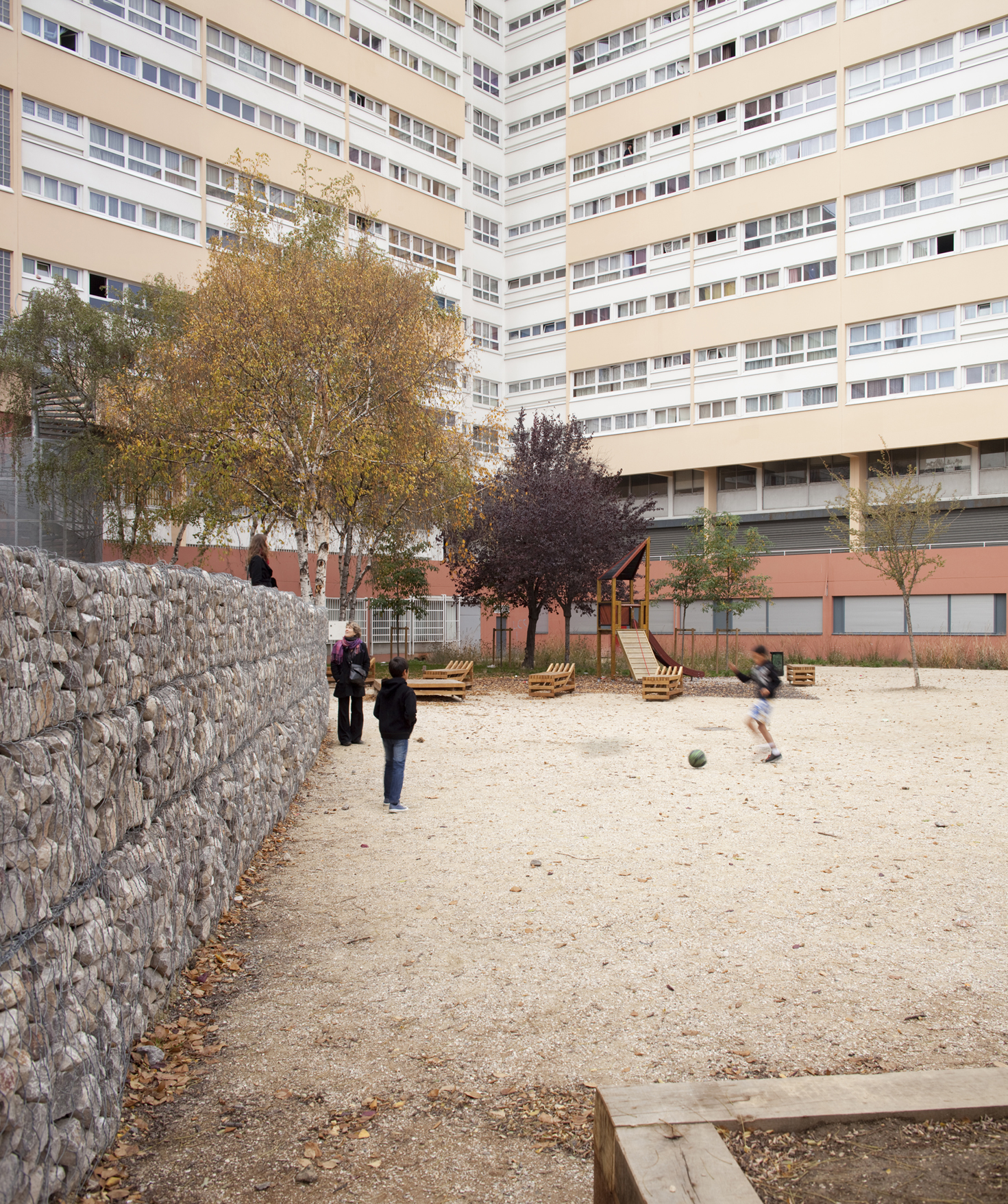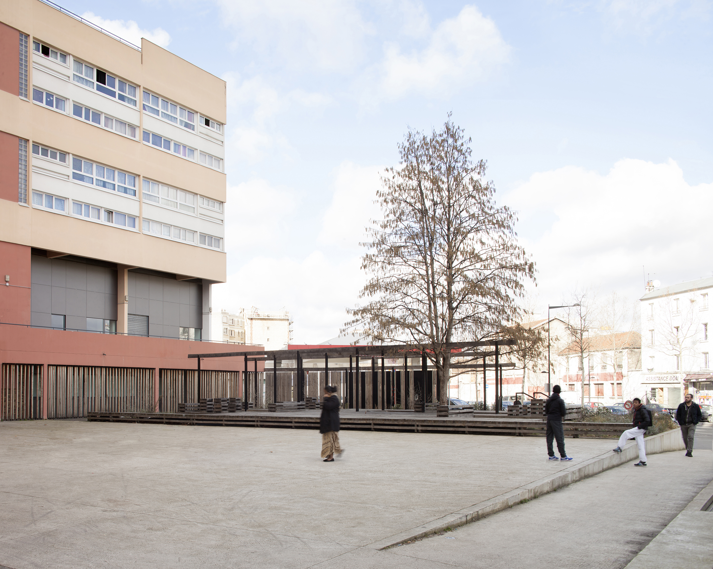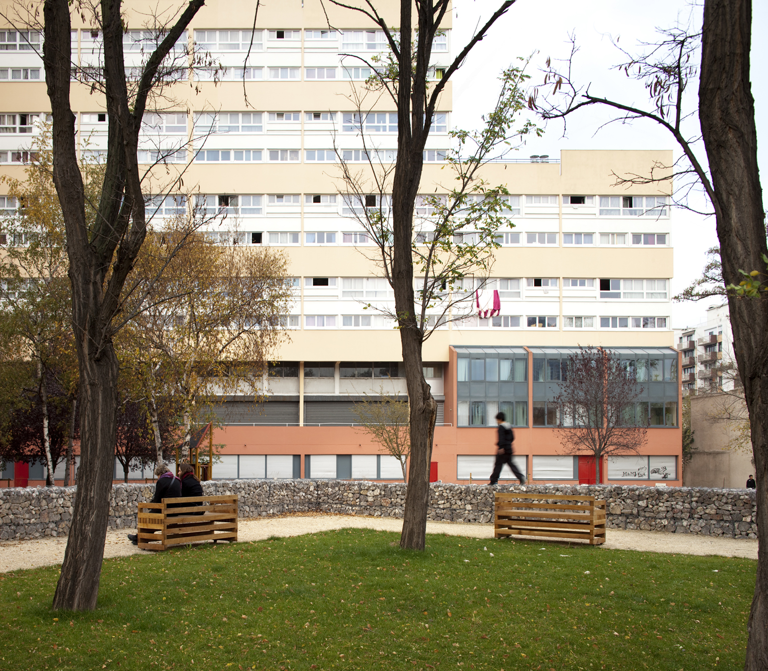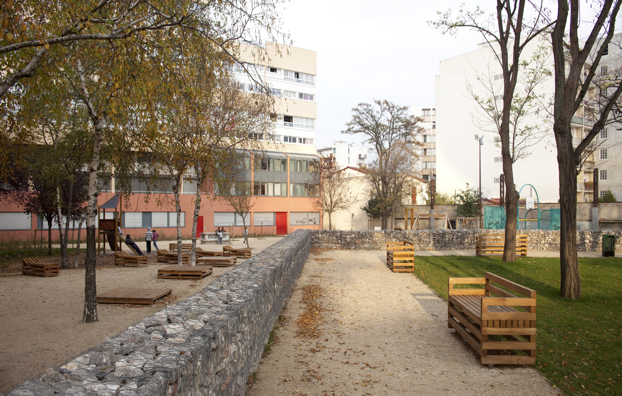 Le square: perspective depuis l’accès et traversée menant au siège de l’OPH d’Aubervilliers.