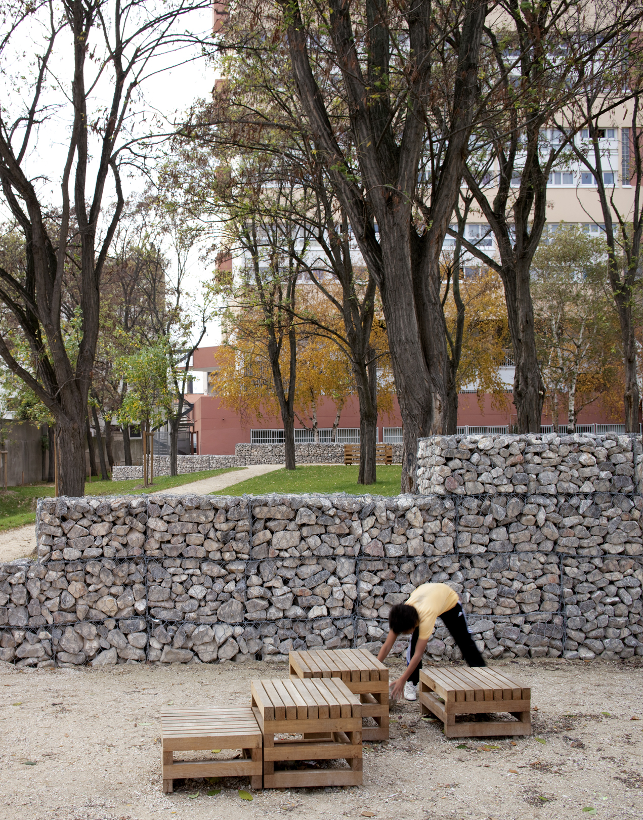 Le mobilier urbain a été conçu spécifiquement pour le site, entièrement réalisé en pièces de chêne massif non traité issu de forêts régionales.