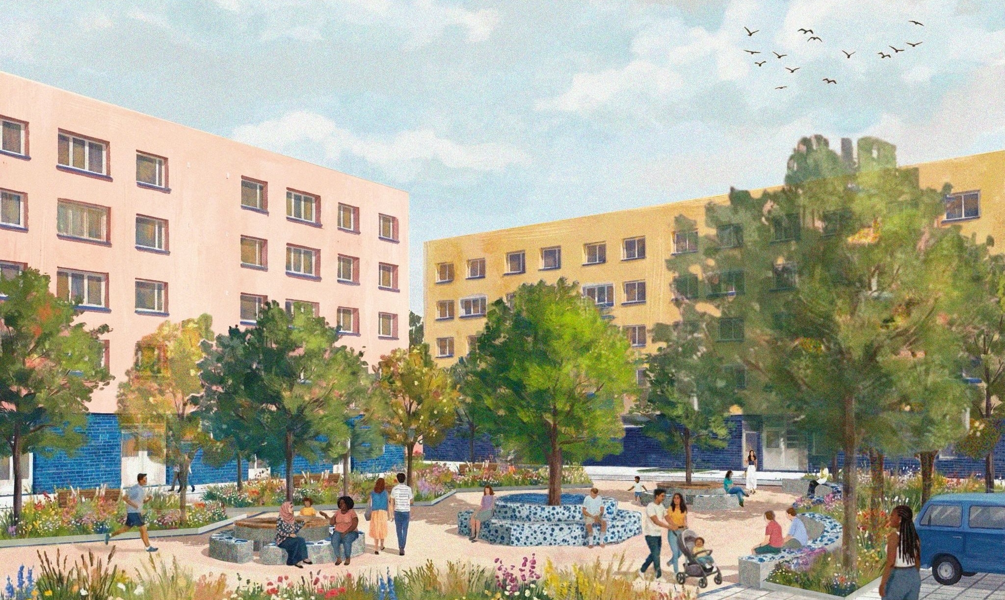Les enjeux de cette réhabilitation sont nombreux, ce qui la rend stimulante et unique. À l’évocation de la cité des 4000, nos premières images mentales furent celles d’un quartier au passé douloureux, dont l’histoire impacte toujours l’image et la vie de La Courneuve. Sur place nous avons découvert quatre bâtiments austères de par leurs façades. Pourtant, de leur hauteur, envergure et organisation émanent à la fois un sentiment de protection et de respiration qui tranche avec les barres voisines et se rapproche des pavillons voisins. Nous comprenons alors pourquoi cette cité a été épargnée des grandes opérations de démolition.