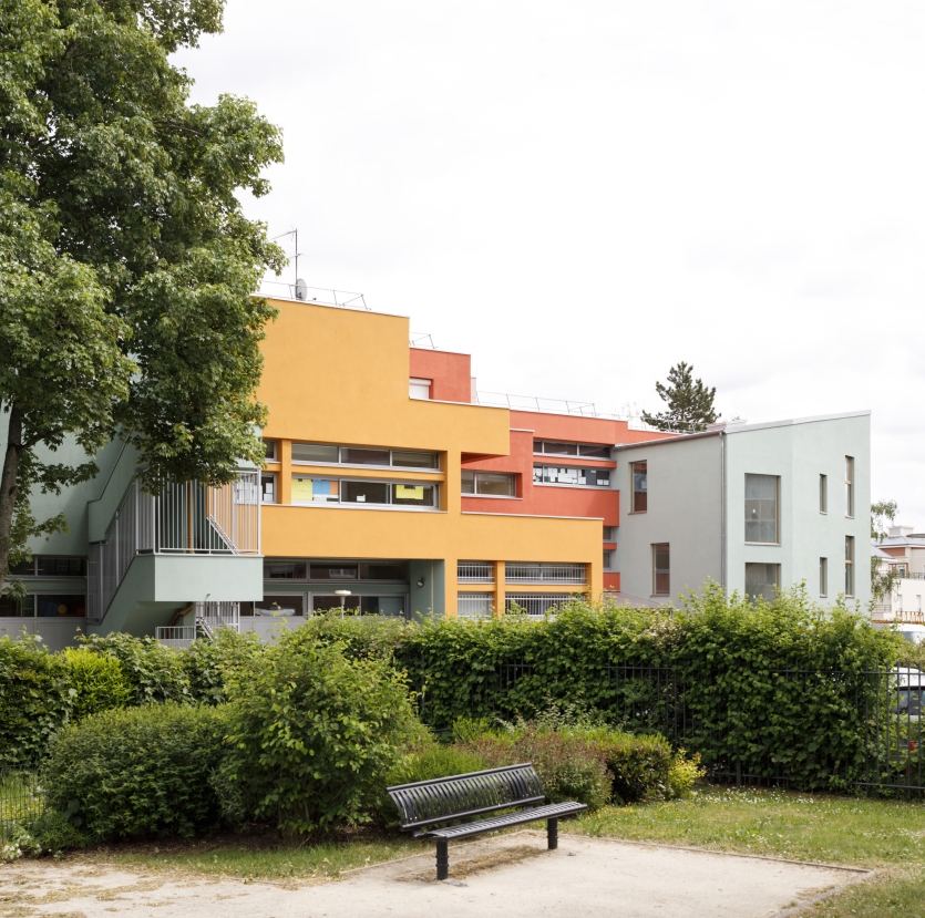 La volumétrie du groupe scolaire est révélée par les couleurs joyeuses.